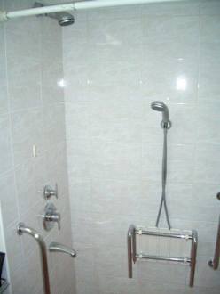 Ein behinderten gerechtes Badzimmer. Die Dusche ist ebenerdig mit Duschsitz!