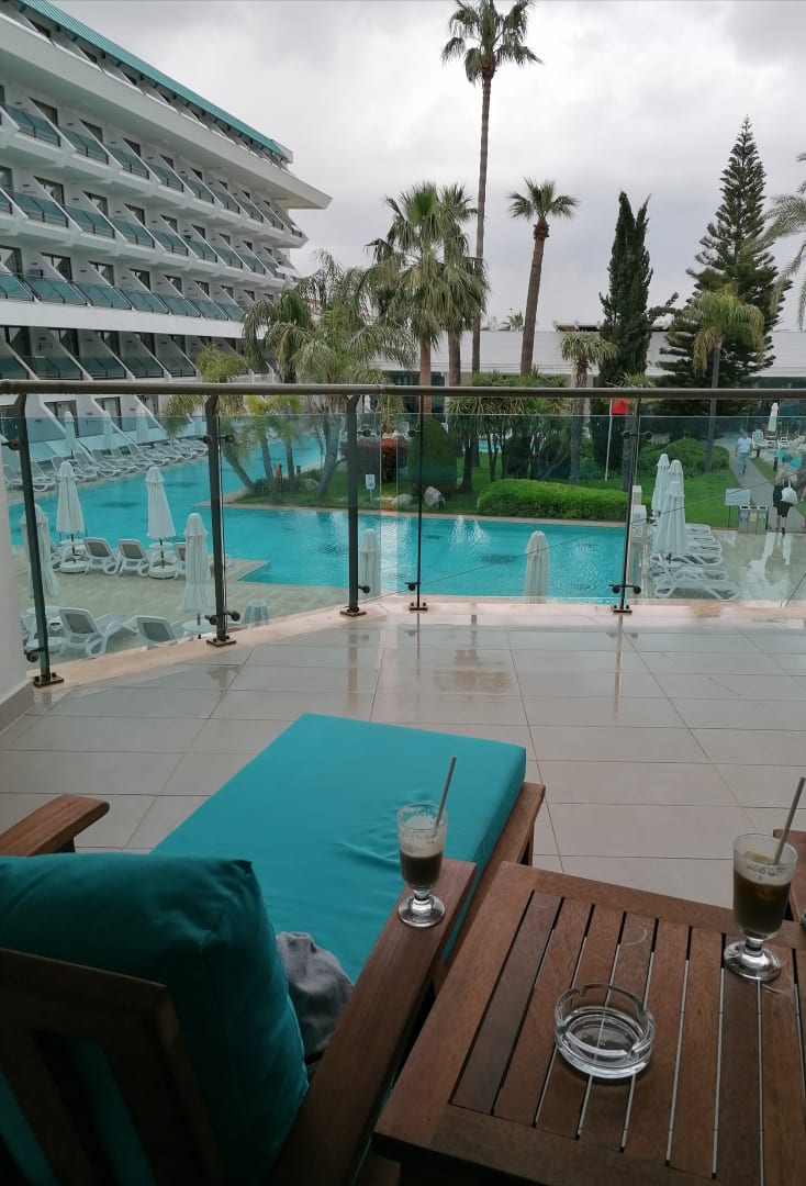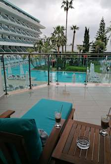 ZimmerBlick von unserer riesigen Terrasse (Suite mit Blick zum oberen, beheizten Pool). Bei Regen gut zu nutzen da überdacht