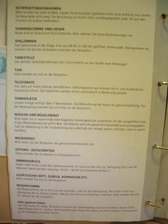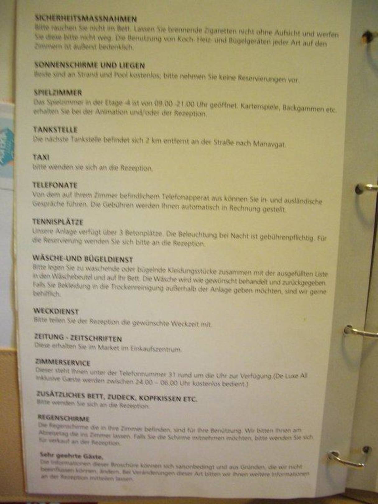 Die Seite 7 der Hotelmappe beschreibt: Sicherheitsmaßnahmen Sonnenschirme und Liegen Spielzimmer Tankstelle Telefonate Tennisplätze Wäsche- und Bügeldienst Weckdienst Zeitungen - Zeitschriften Zimmerservice Regenschirme