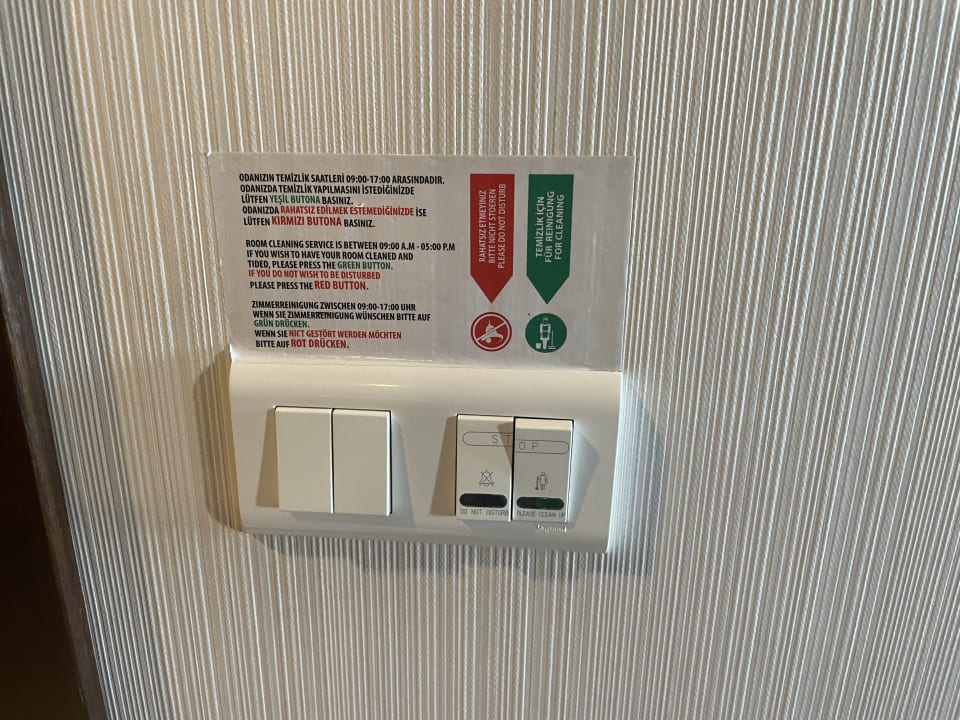Im Flur neben dem Lichtschalter der Schalter falls man nicht gestört werden möchte. Bei Leichtfertiger falscher Betätigung erfolgt keine Reinigung