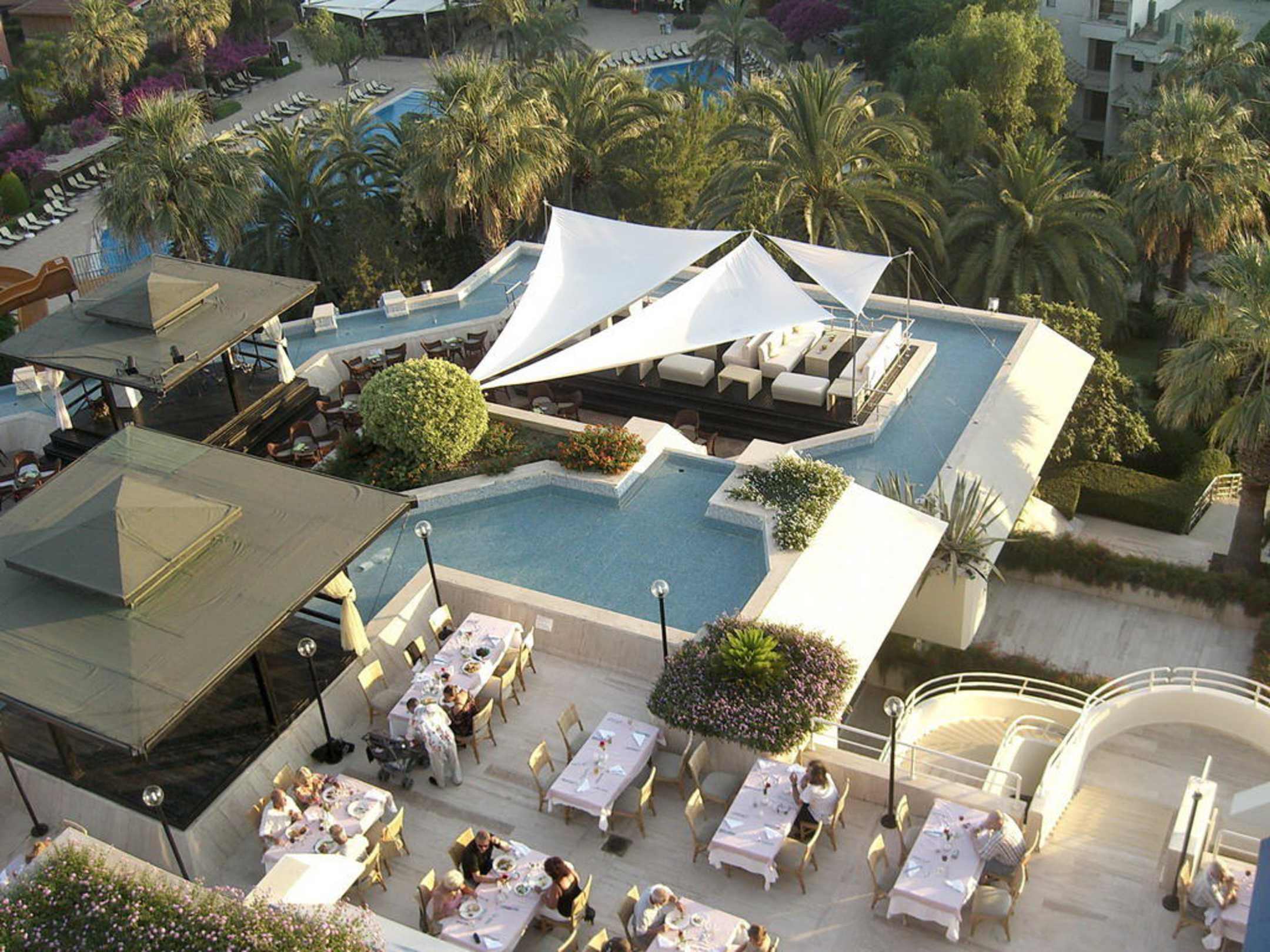 Blick auf einen Teil des Aussenrestaurants, die Düdenbar und der Poolanlage