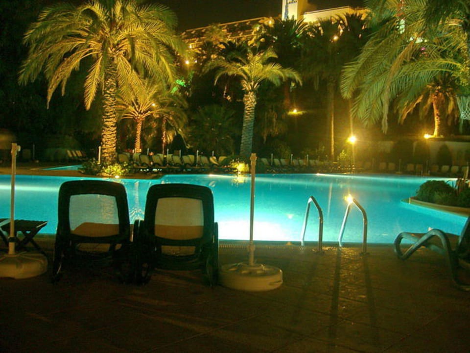 beleuchteter Pool am Abend