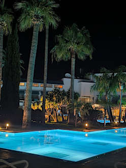 Poollandschaft vom Zimmer bei Nacht