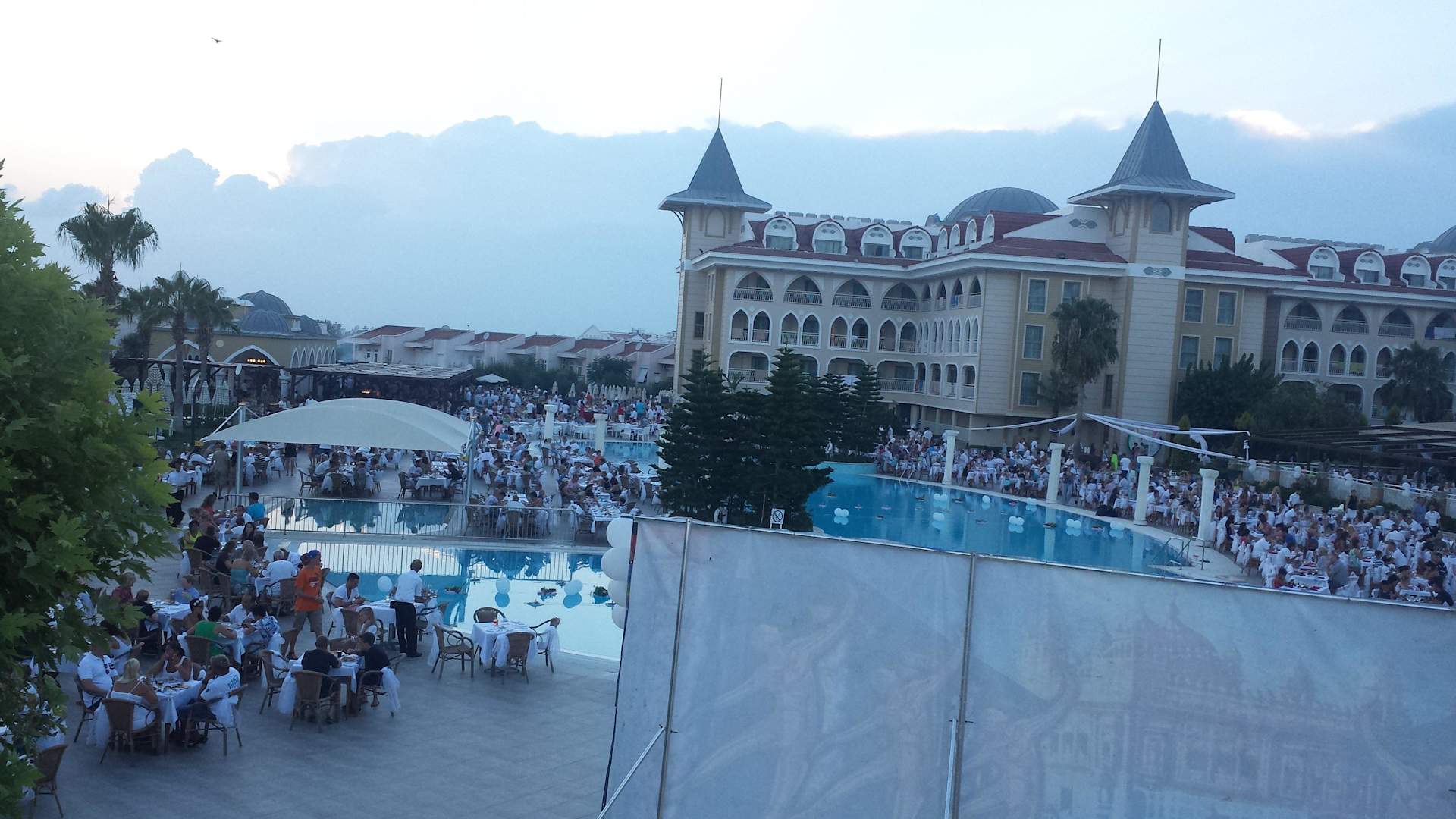 Pool mit Tischen und Gästen bei der White Night