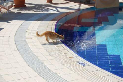 Mittags am Pooldie Hauskatze beim löschen Ihres Durstes