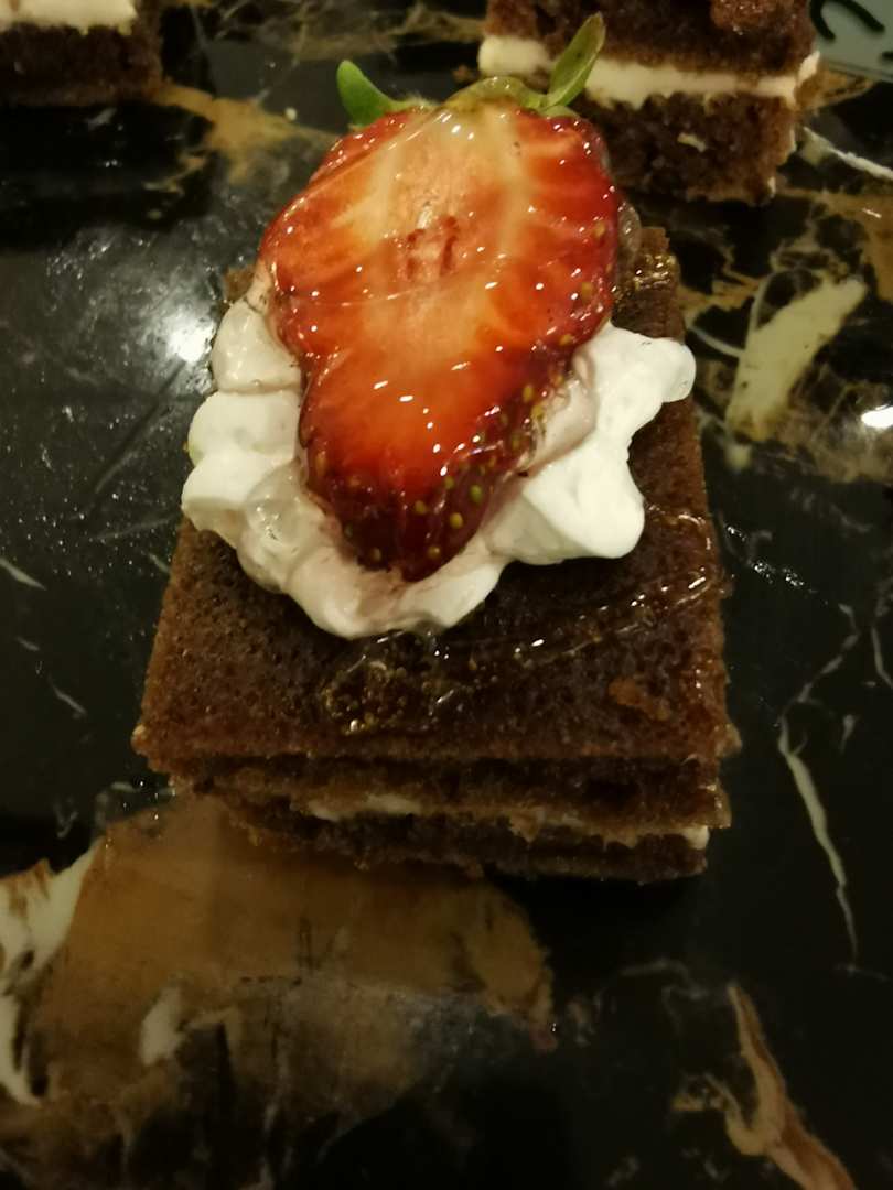 Ein Stück Kuchen mit Erdbeeren
