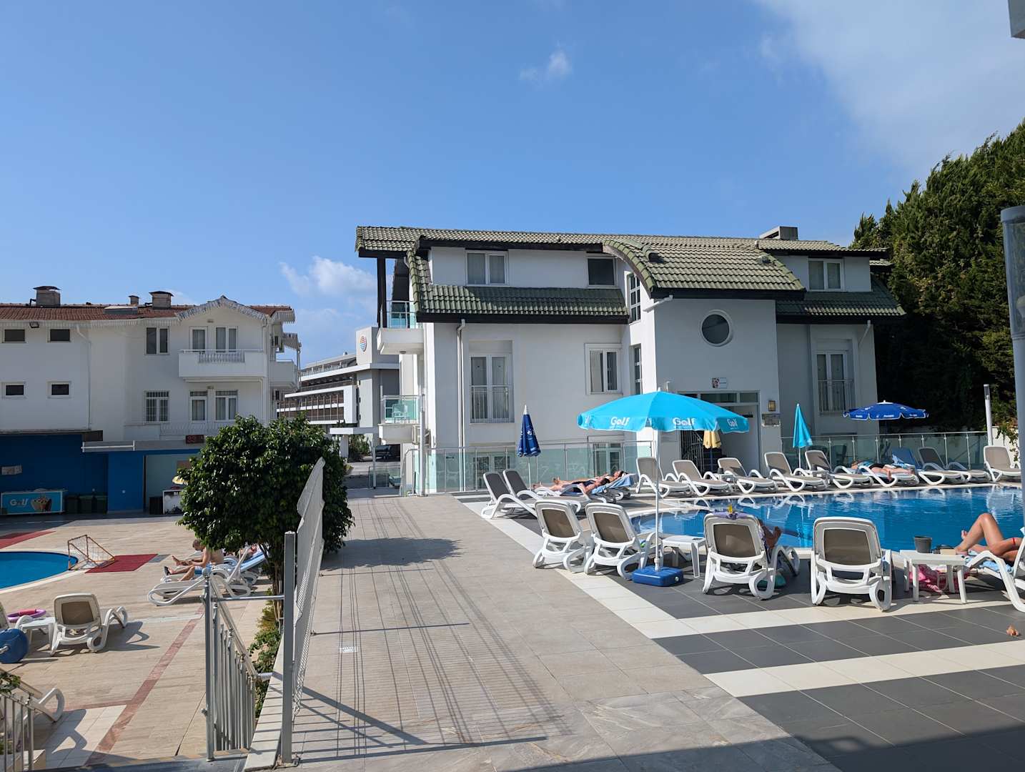 2.pool gegenüber Aktivpool. Blick auf 2 Wohnhäuser ( ohne Fahrstuhl)