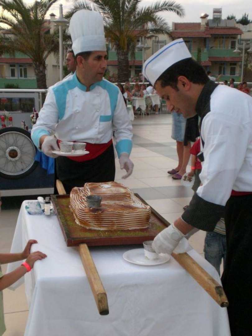 EistorteMit grossen pannengekletter wird durch das kuchenpersonäl ein riesigen eistorte das restaurant hingebracht!!