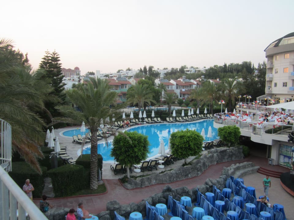 Poolanlage mit Blick von den Wasserrutschen