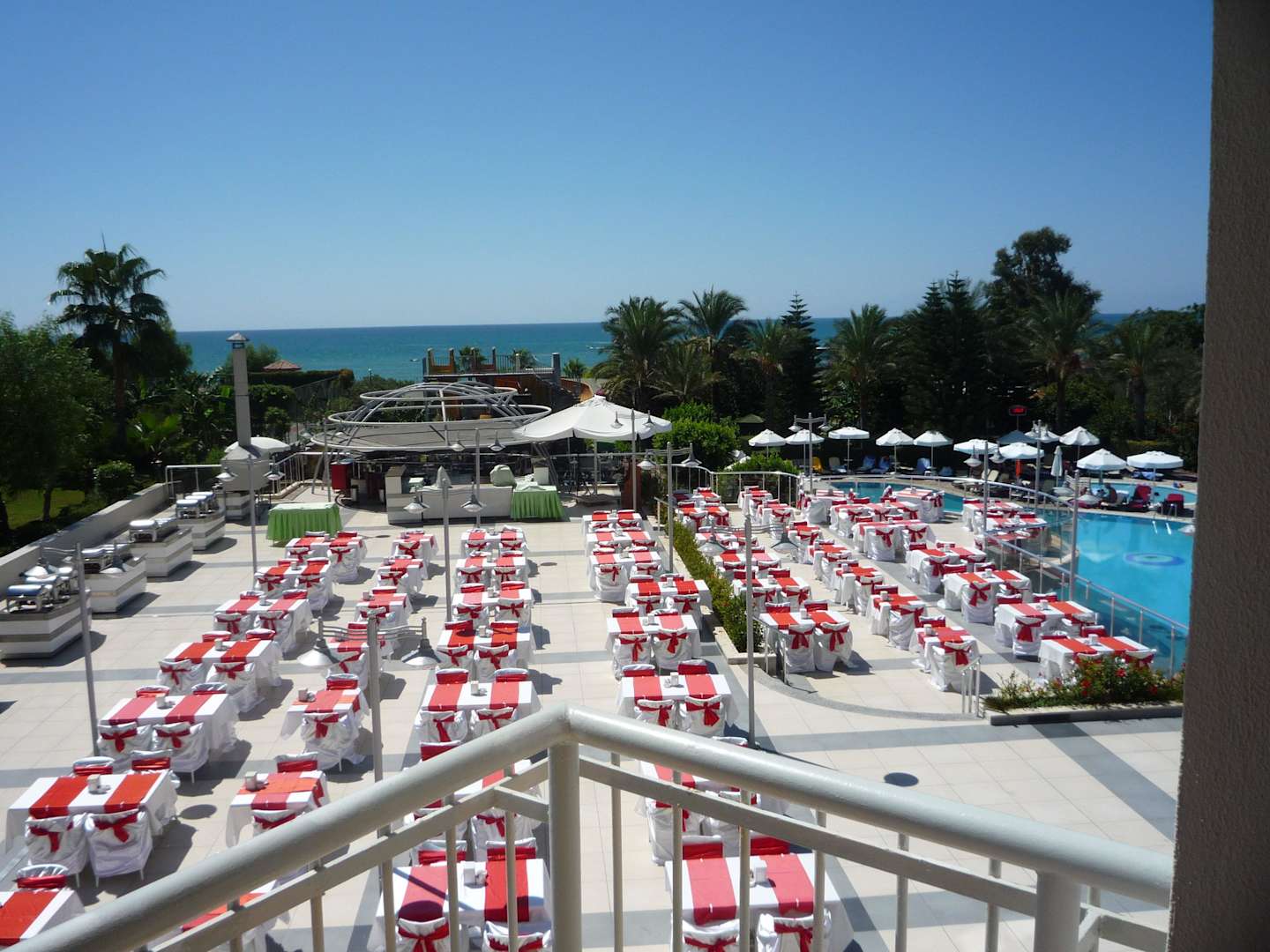 Terrasse und Pool , im Hintergrund Bühne und Rutsc