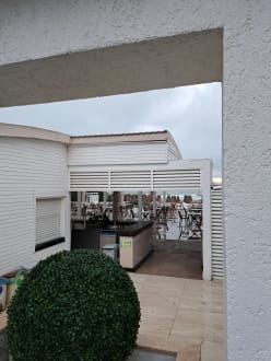 Blick in die bei schlechtem Wetter geschlossene Beachbar