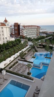 Blick über die Hotelpools zum Meer