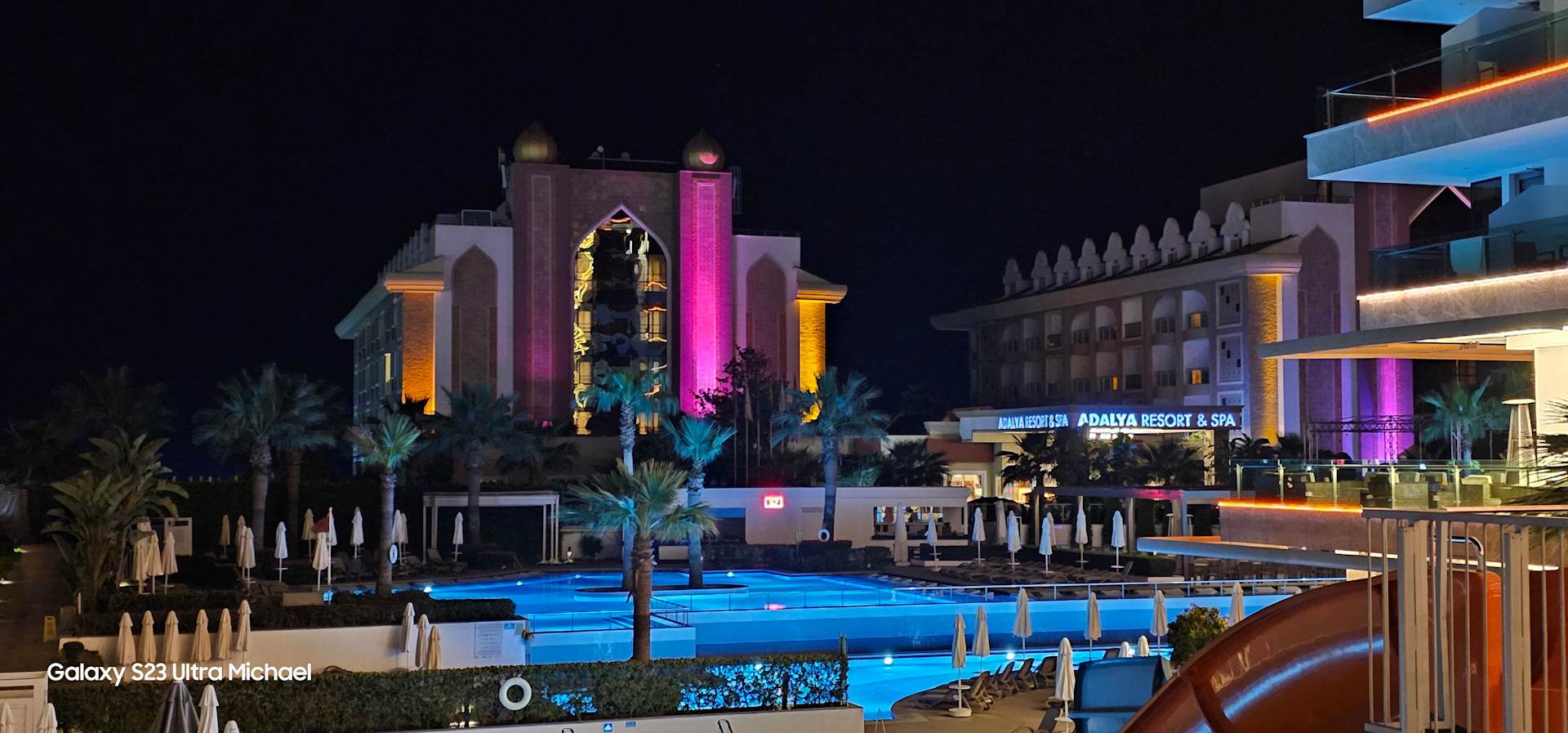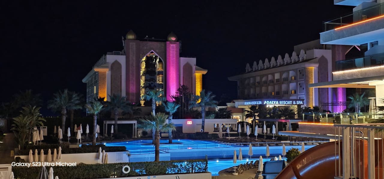 Von der Hotelterrasse mit Ausblick zum beleuchten Pool.