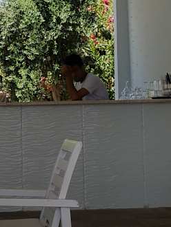 RestaurantDer poolbarkepper mit seiner Liebling beschäftigung: whatsappen mit dem handy.