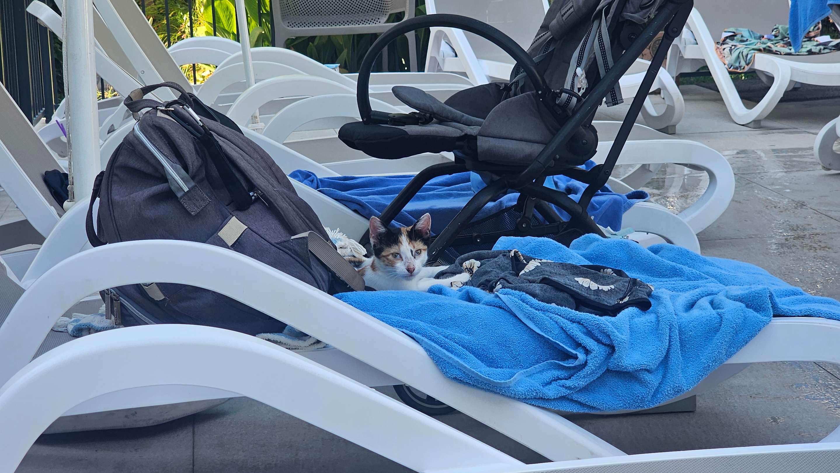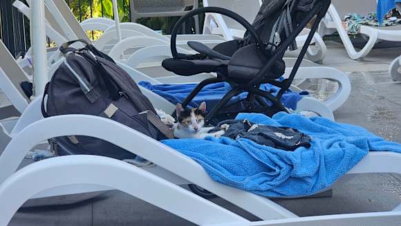 Katze am Pool, gute Strandliegen
