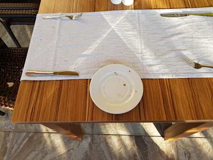 So sahen die Tische zum Frühstück jeden Tag aus (Hauptsache frisches Besteck im Dreck) !