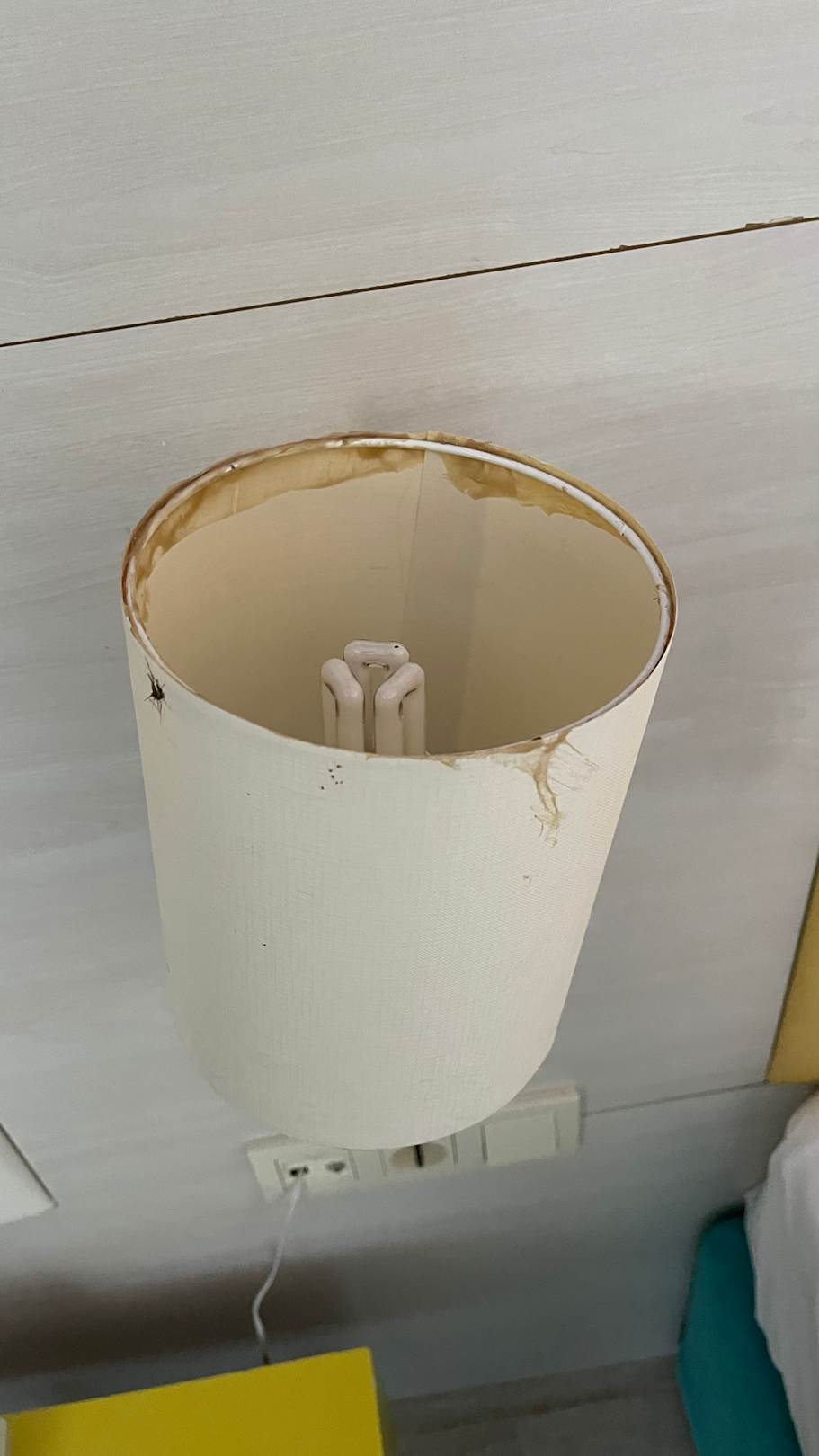 Tote Fliegen, Blutflecken. Bettlaken mit gelben Flecken