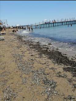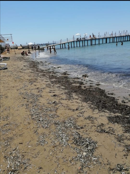 Leider dreckigster Strandabschnitt. Felsen und Steine im Wasser. Verletzungsgefahr