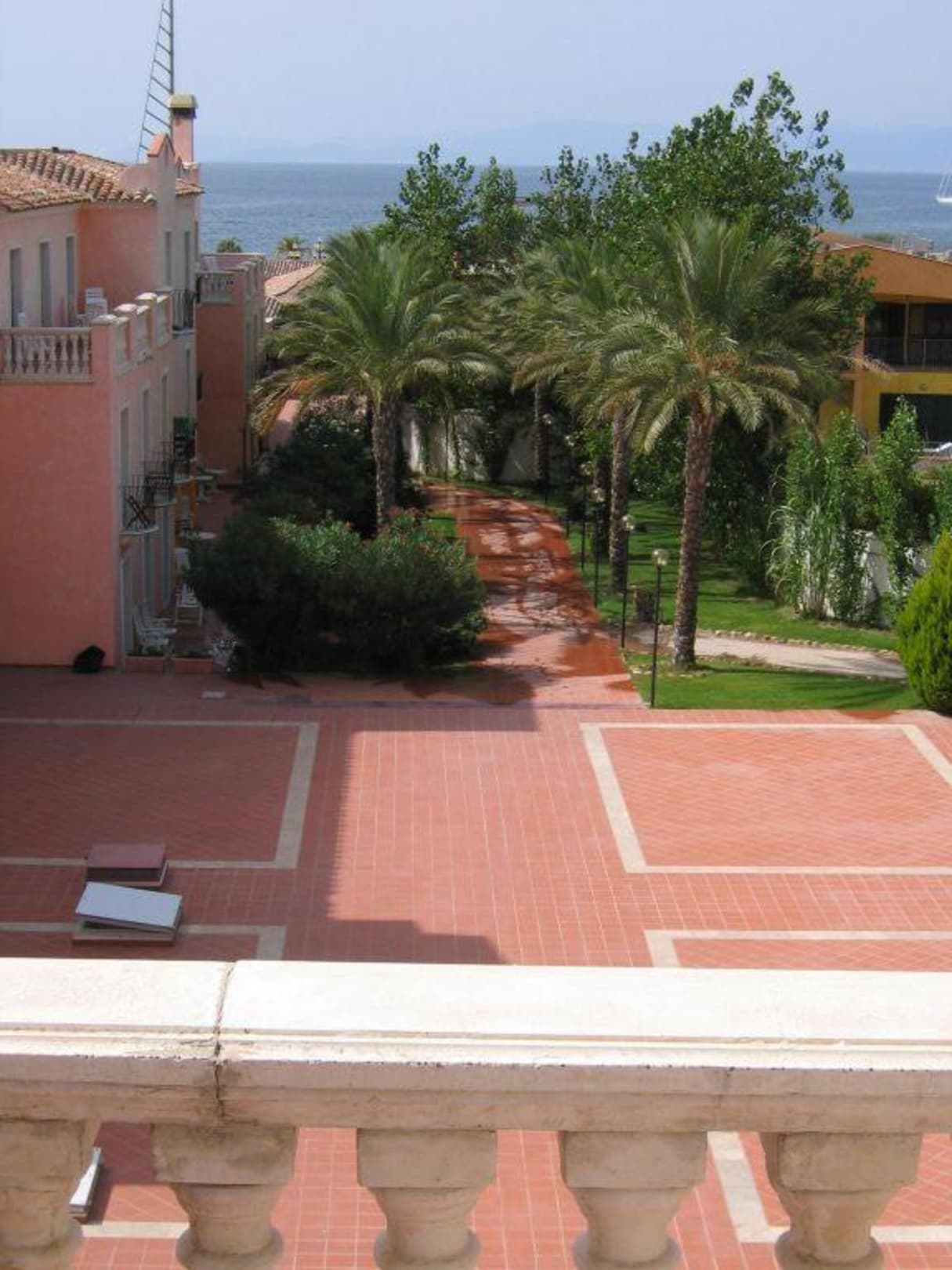 Hier unser "Meerblick". Auf der linken Seite sieht man das Hotel mit den grossen Balkonen (wie unserer), aber auch die kleinen "Ein-Mann-Balkone". Kann das in der Mitte ein Palmengarten sein??