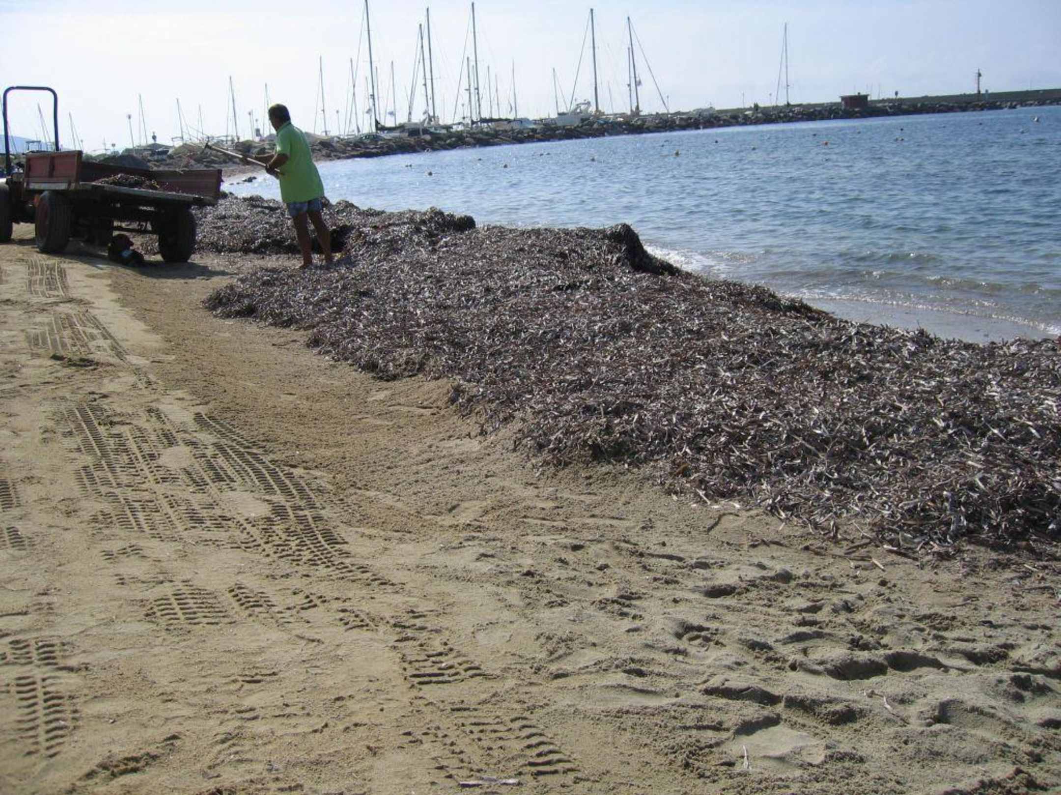 Dieser Mitarbeiter scheint das Seegras gerade wegzuräumen.