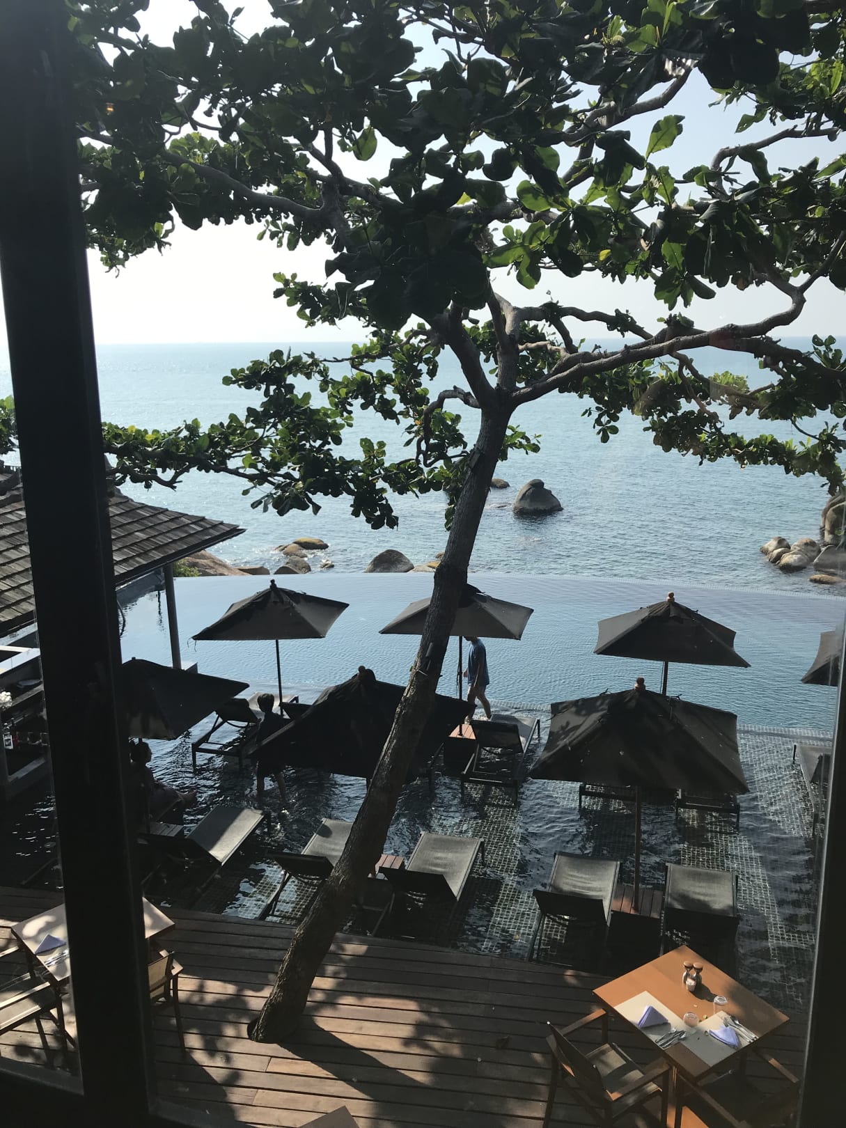 Blick vom Restaurant Moon (Frühstück und Dinner) auf die Poolbar und Meer.