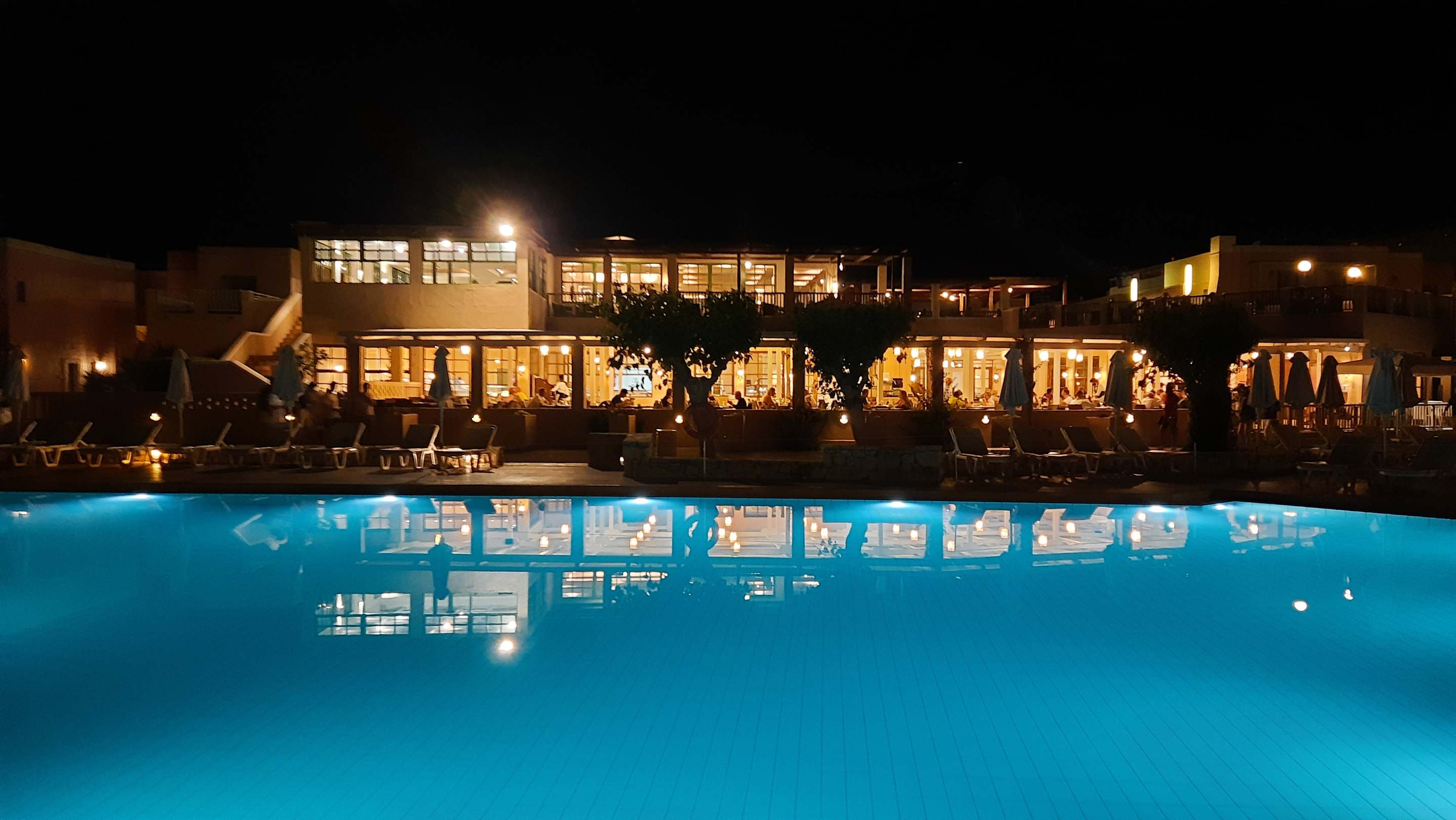 Blick auf das Hauptrestaurant vom zweiten Pool am Strand/an der Promenade