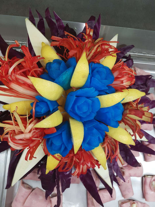 Decko beim Abendessen zwischen den Speisen.