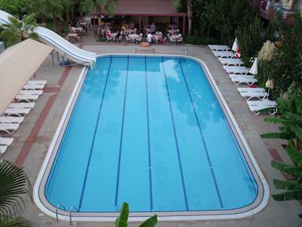 Blick vom Zimmer auf den Pool