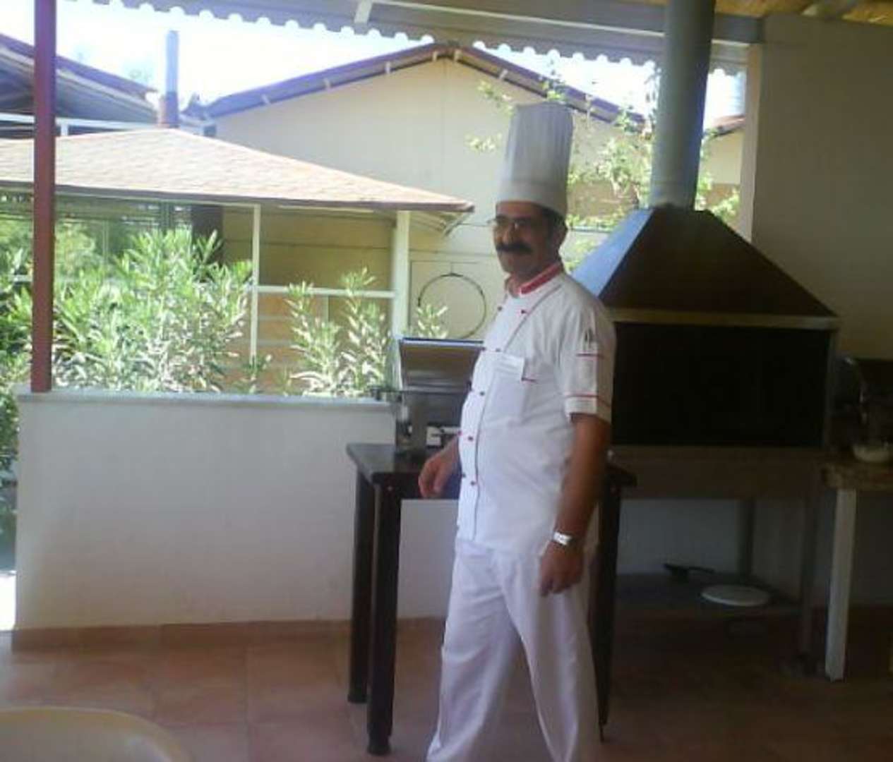 StrandbarDer erste Koch des Hotels vor dem Steinofengrill der Strandbar des Hotels Silver in Colakli, türkische Reviera