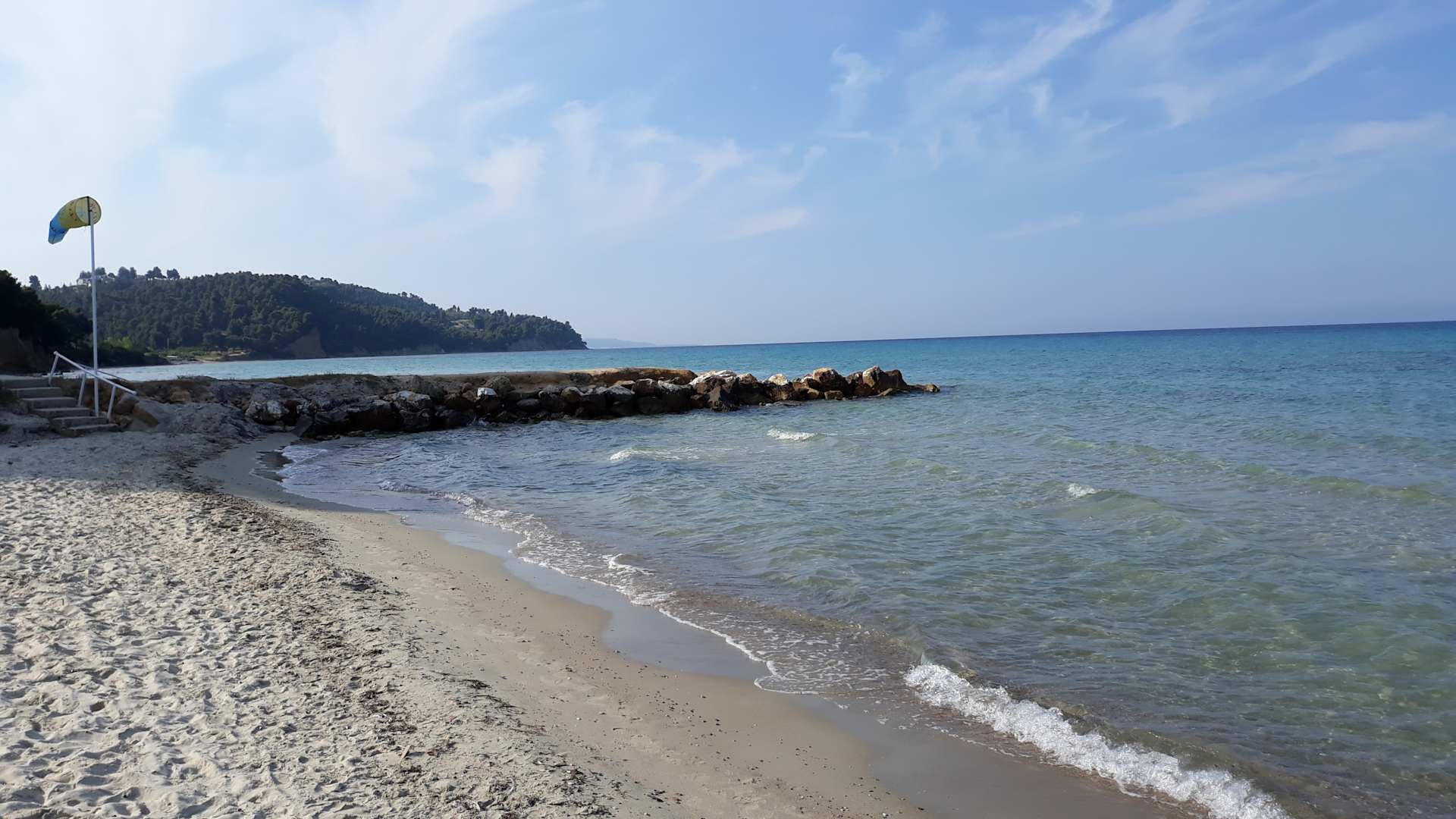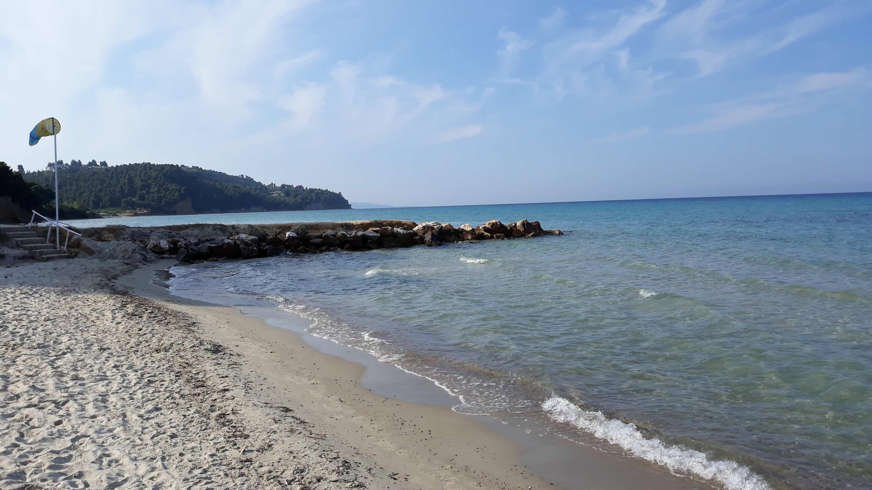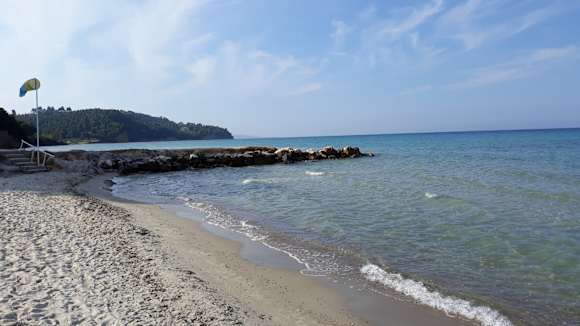 Sehr schöner feiner Sandstrand. Auf dem Weg in Meer gibt es ca. 50 cm breiten Streifen mit kleinen Kieselsteinen, aber danach kommt wieder reiner Sand. Wunderschön