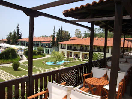 Ausblick von der Bar über der Rezeption Richtung Pool mit Gartenanlage.
