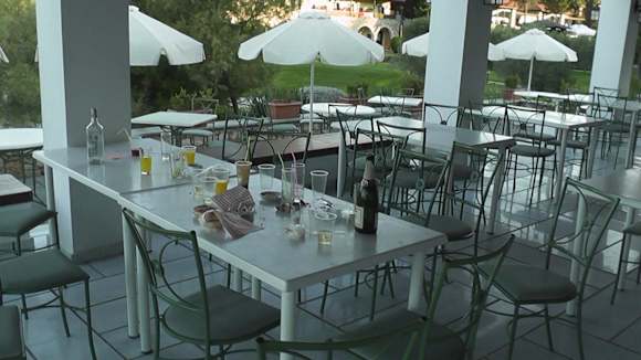 Tische in Taverne kurz vorm Frühstück