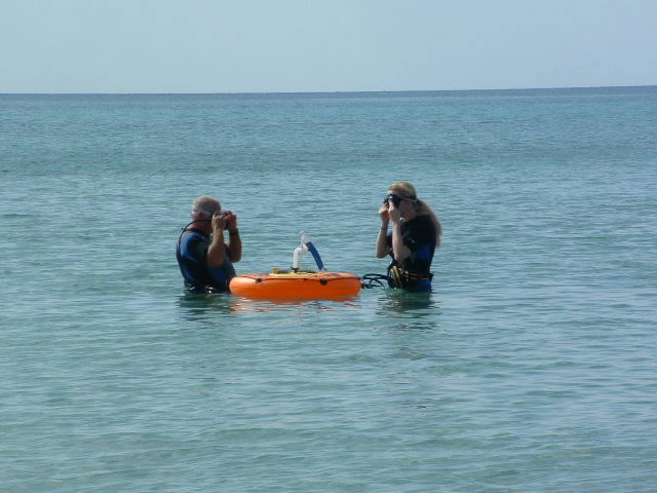 Vor dem "Abtauchen"Im Schwimmring ist der Kompressor, der die Taucher mit Atemluft versorgt. Bis zu 45 Min. können 2 Personen bis in 8m Tiefe am Hausriff des Simantro-Beach-Hotels die Unterwasserwelt beobachten. Außerdem geht es 3x die Woche auf Schnorchel/Tauchsafari mit Wrackbesichtigung.
