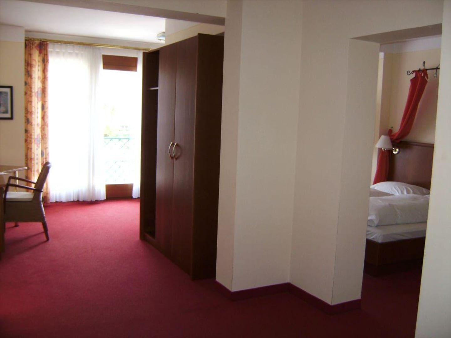 Da kann man einmal um die Wand rumgehen. Hinter der Wand ist das Bett, daneben eine Couch und ein Fernseher. Wenn man links durchgeht kommt man ins 2. separate Zimmer wo 2 gemütliche Hocker und noch ein Fernseher stehen.