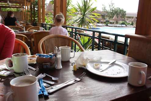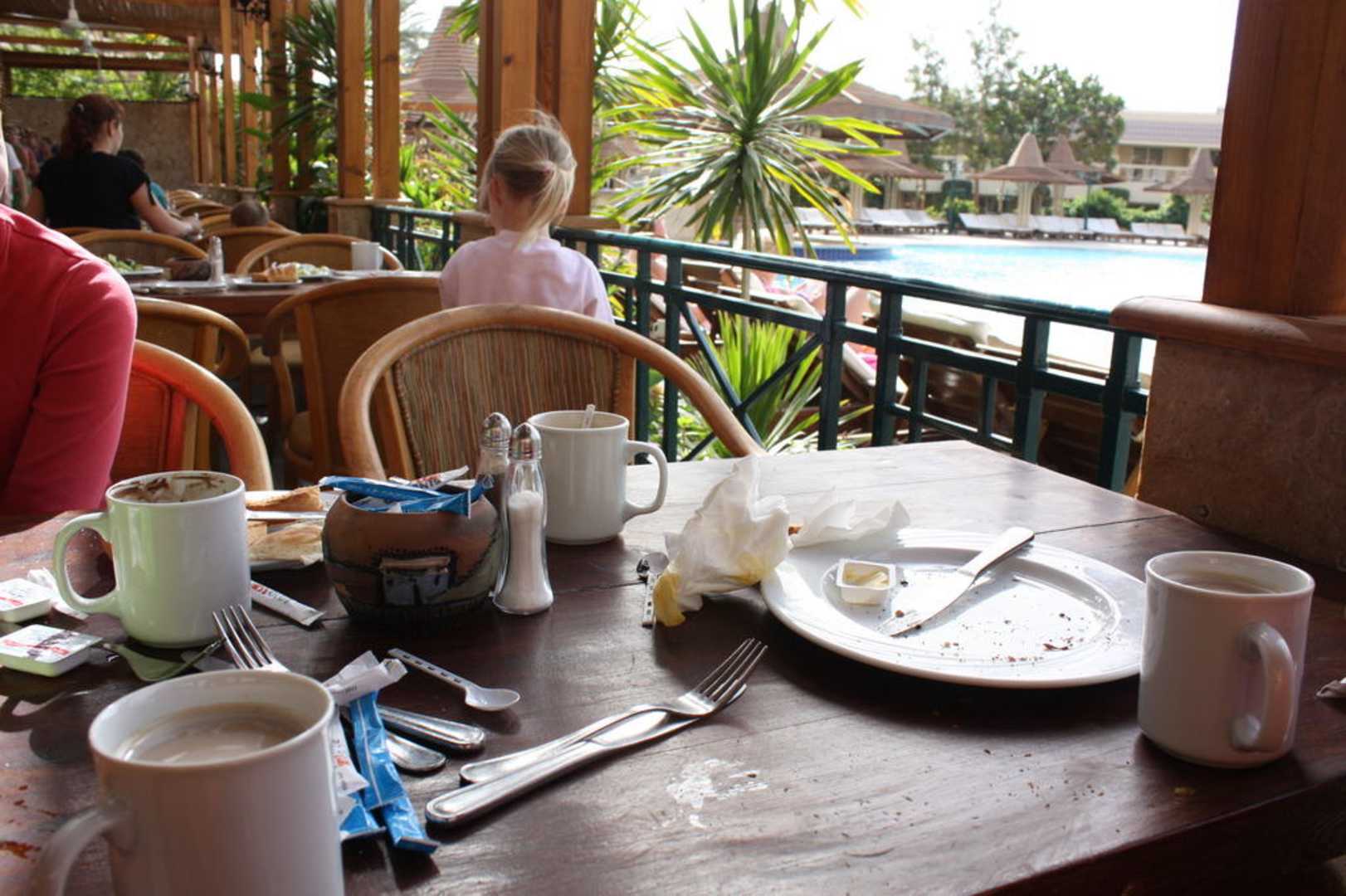 Man setzte sich hin, und keiner räumte weg. Man hatte selber alles in der Ecke geschoben. Irgendwann kam dann jemand und sprach - finish ? - so wie, kann ich das weg räumen ? Nur die Tische kleben weiter.