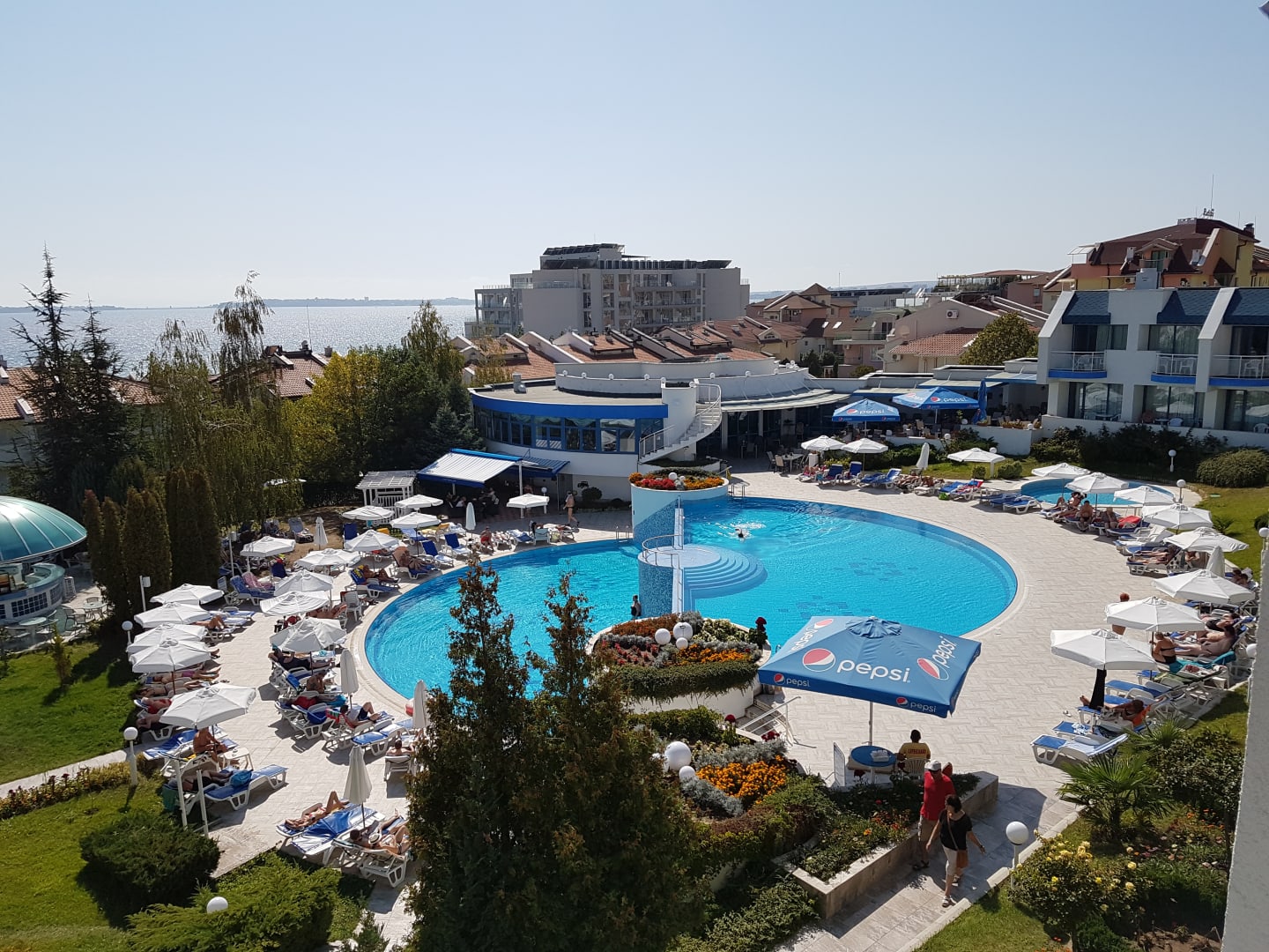 Zimmer mit Meerblick, Balkon in Richtung Poolanlage, im Hintergrund das Restaurant
