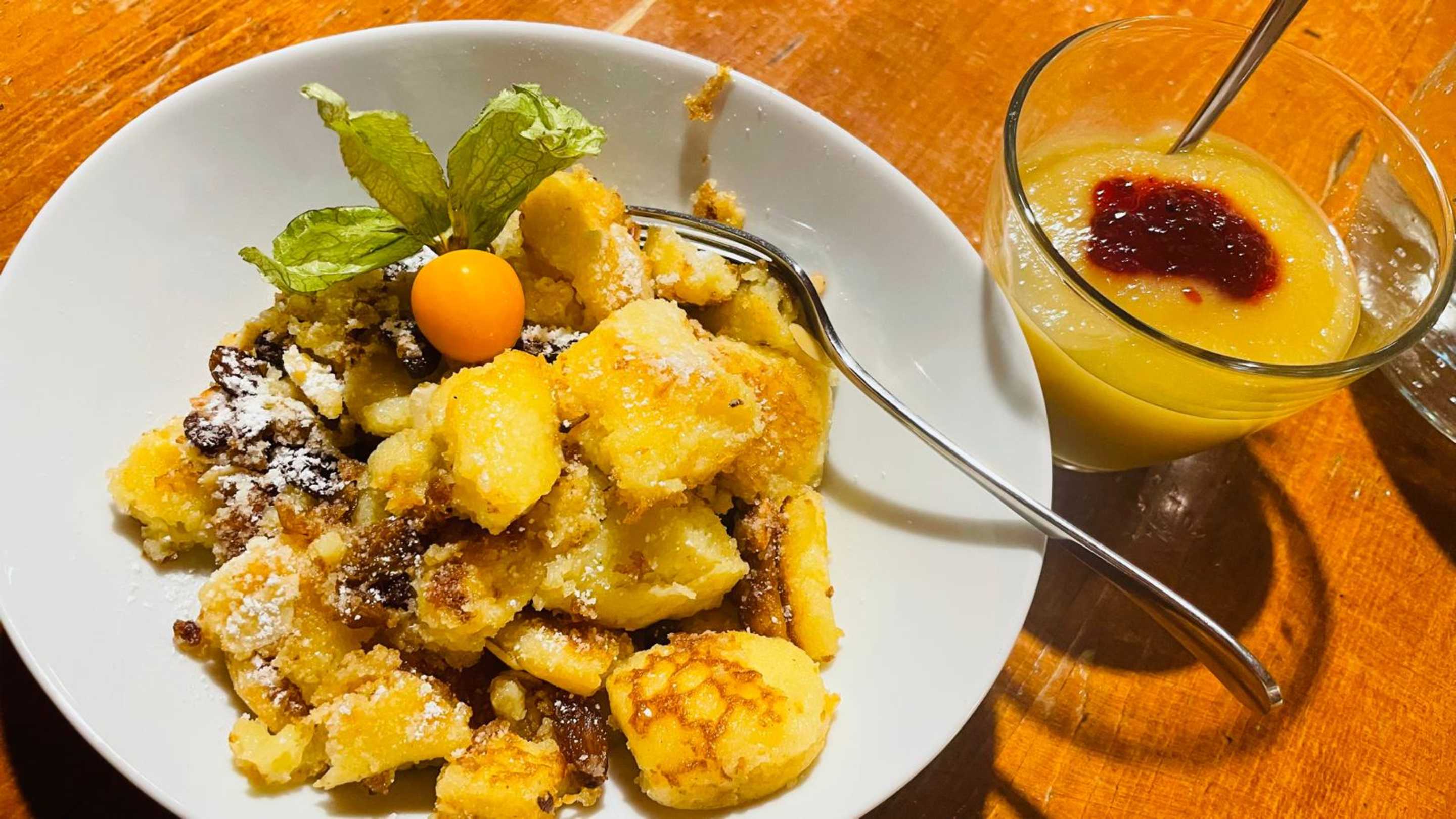 Kaiserschmarren mit Rumrosinen, Puderzucker und Apfelmus.