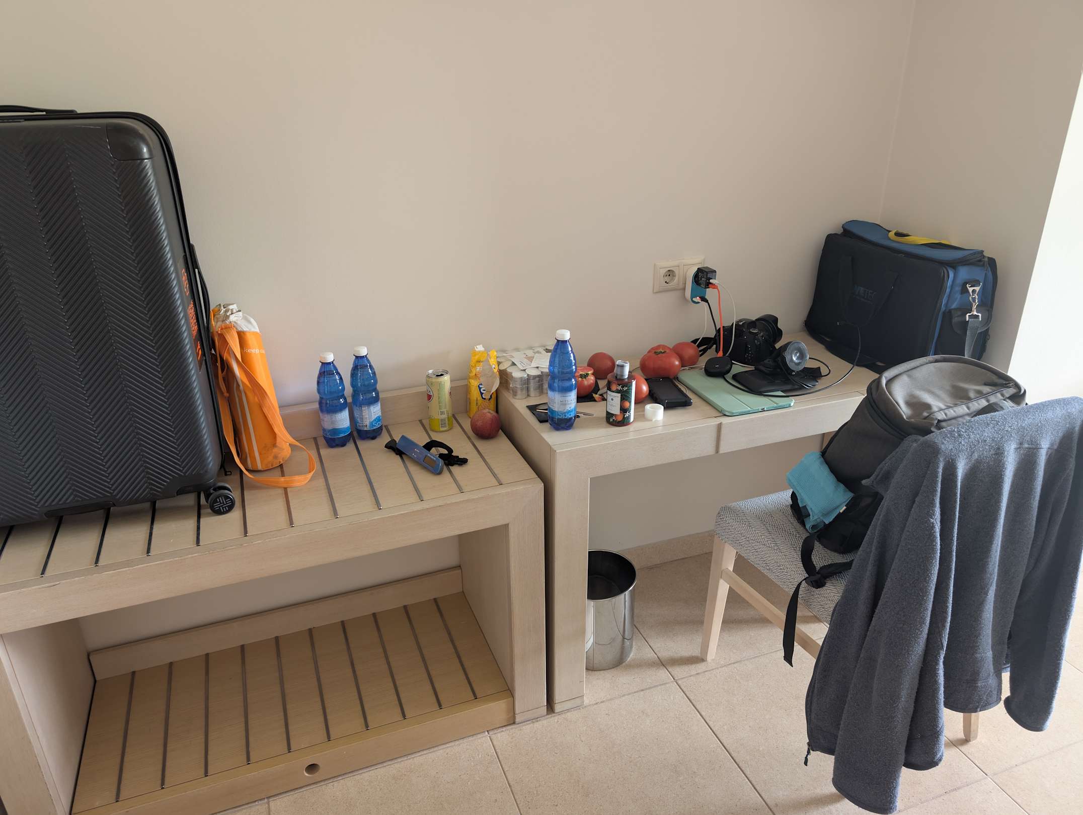 Schreibtisch und Kofferablage.