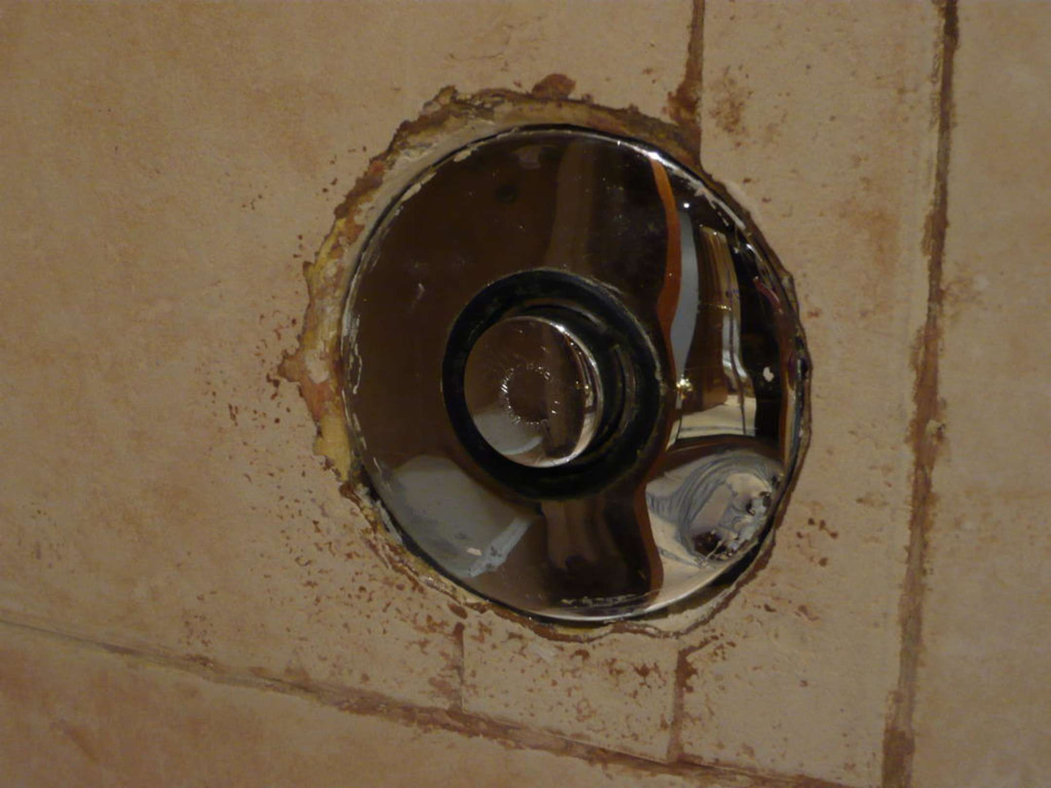 Druckknopf der Toilette in unserem Zimmer. Erst war er locker wie ein Kuhschwanz, dann haben sie ihn nochmals mit Silikon ausgefüllt. Trotzdem ist der Druckknopf völlig falsch montiert.