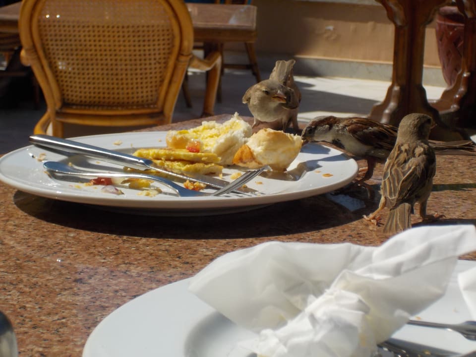 obwohl wir am Tisch gesessen hatten, vielen die Spatzen über den Teller in Scharen her. Die kleine Frühstücksterrasse wo man normalerweise einen Kaffee und Zigarettchen genießen wollte völlig verdreckt von Vogel Scheiße..