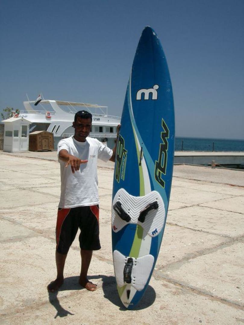 Freundlicher, kompetenter Mitarbeiter der Surfstation links am Strand
