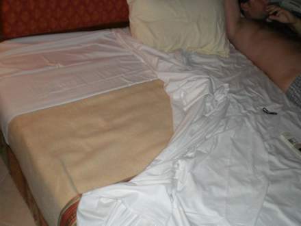 Hier sieht man das die Betten bereits, unter unserem Laken, neu bezogen waren.