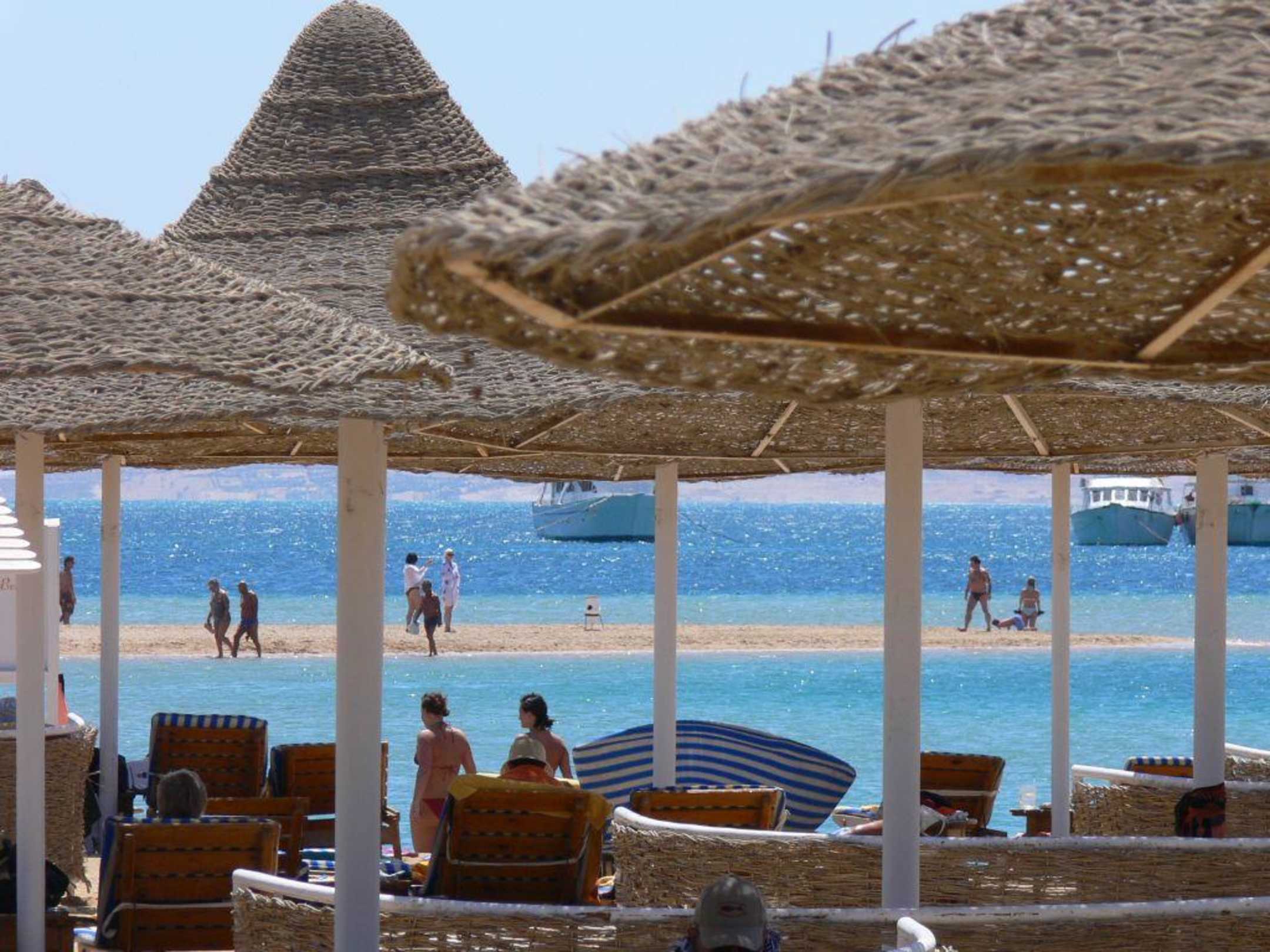 Blick vom großzügigen Strandbereich des Siva Grand Beach (Nachbarhotel vom Giftun Beach) auf die schöne Landzunge, von der man bei Ebbe noch ca. 200 - 300 Meter im knietiefen Wasser waten kann
