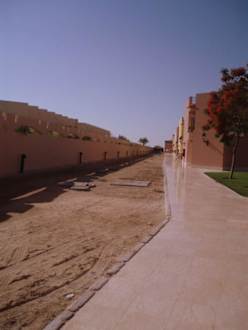 Rechts die Bungalows, links die Mauer