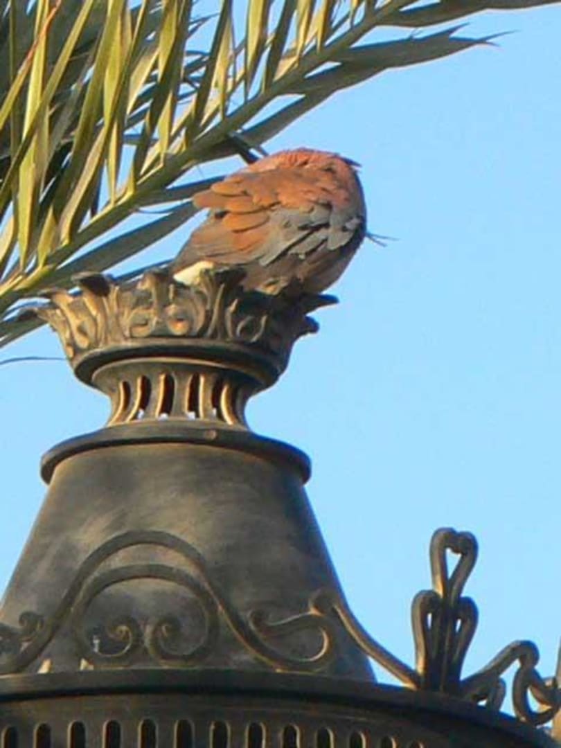 EIne kleine Taube putzt sich auf einer Außenlaterne.