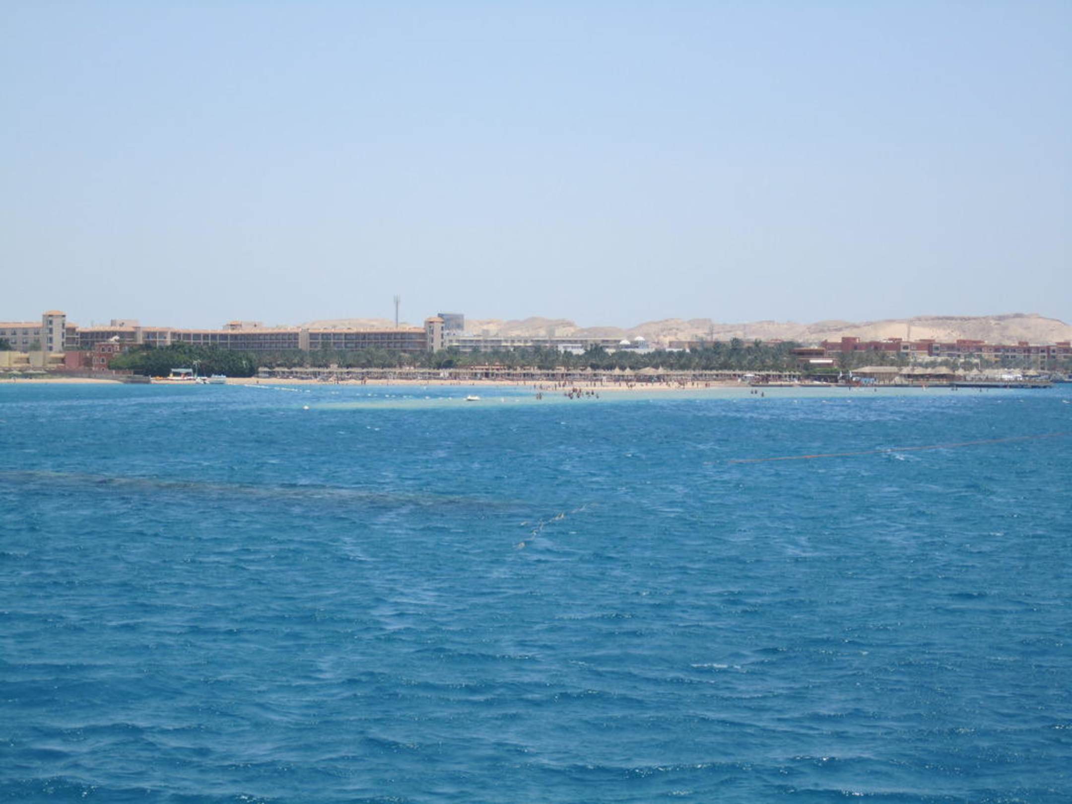 Hotelstrand vom Wasser ausRechts neben dem Steg befindet sich die Surfstation. Die Landzunge ist gut zu sehen.