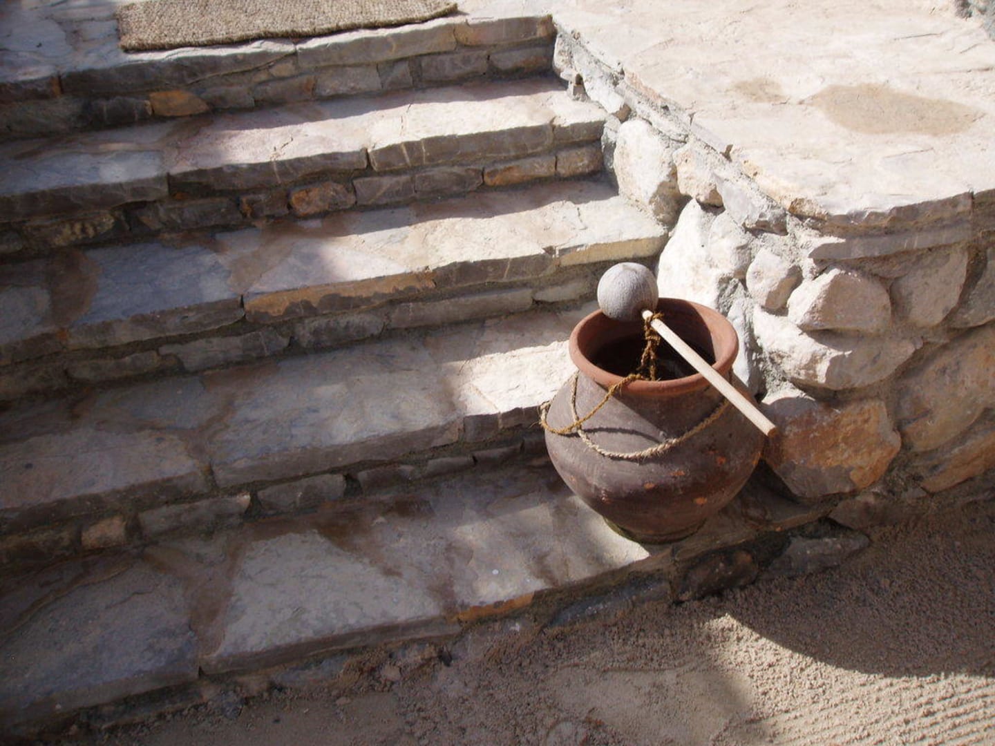 Zugang zur Terrasse der StrandvillaAn der Treppe zur Terrasse unserer Strandvilla gab es diese Krüge mit Wasser und Schöpfer zum Sand von den Füßen spülen, wenn man vom Strand kam. Auch an Eingang zur Villa gab es so einen Krug, auch an den Eingängen/Treppen zu den Restaurants usw.