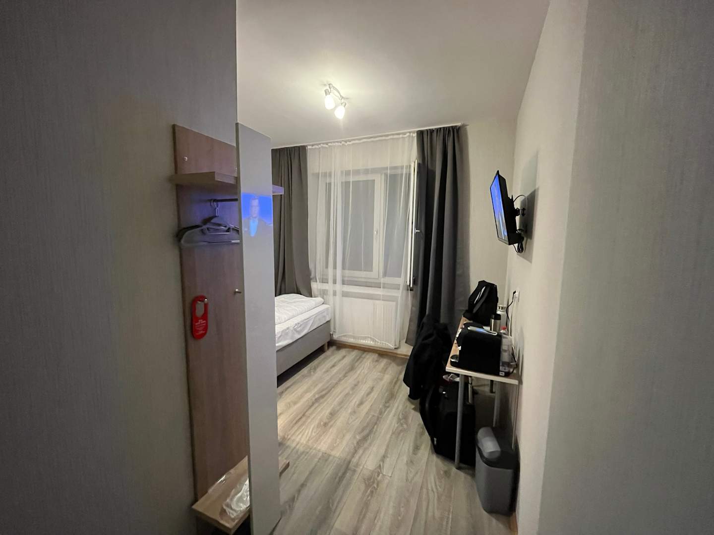 Minigardeobe, kein Kleiderschrank vorhanden, dafür aber Frotteeschlappen