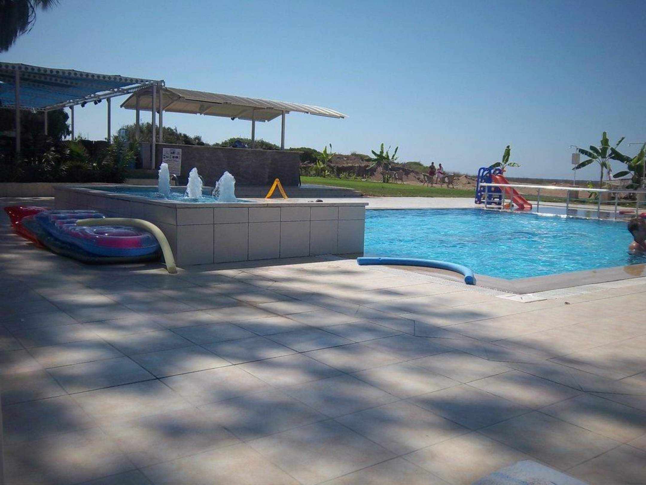 Poolanlage mit Blick auf die Poolbar und auf das Meer