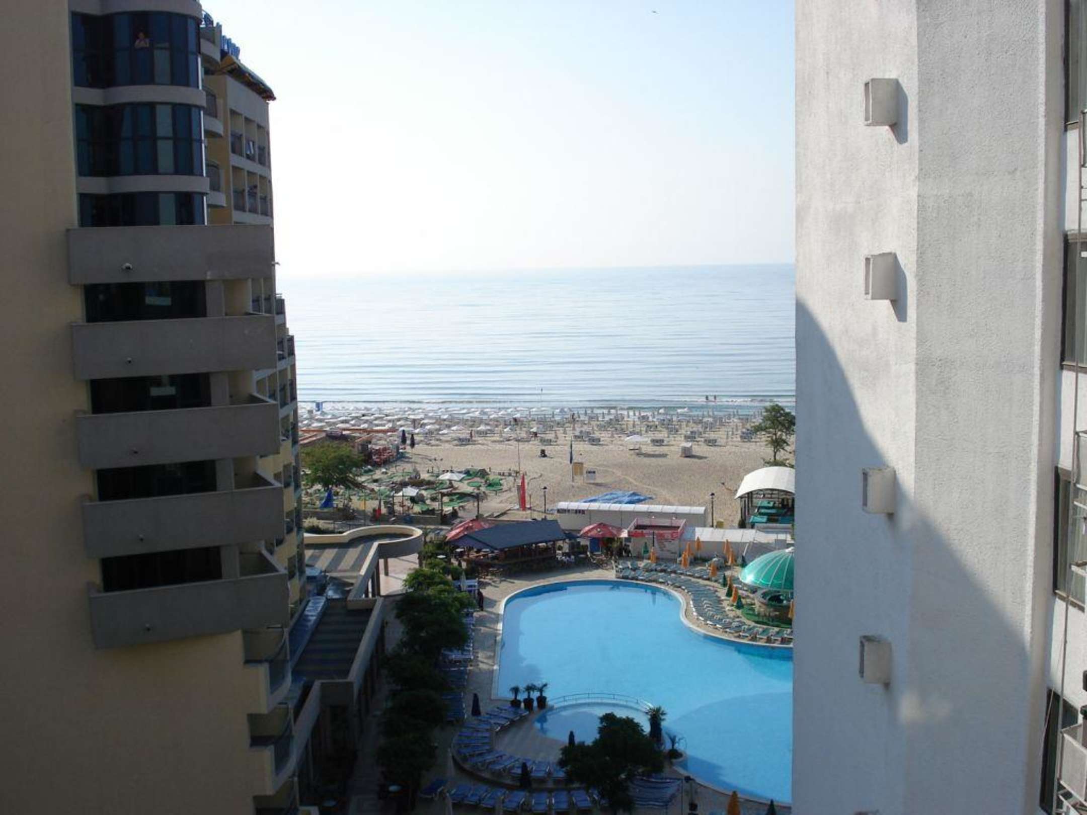 Ausblick zwischen zwei HotelsRechts ist der Altbau von Hotel Slawianski, links ist das Hotel Bellevue (teilen sich auch den Pool). Man fühlt sich schon ein bisschen beobachtet wenn man auf dem Balkon sitzt abends, aber man hat ja nicht Balkonien gebucht sondern strandurlaub!! trotzdem sehr nah dran gebaut, der neubau! Der Altbau ist noch näher an der Promenade! Trotzdem sehr ruhig!